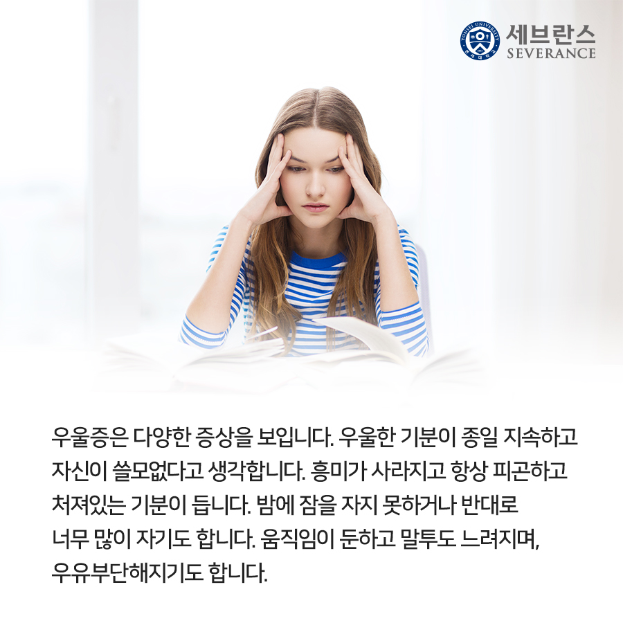 사회에서 혹은 직업으로 자신의 역할을 전혀 하지 못하거나 어려워집니다. 이런 상황이 많이 발생하면 치료를 받아보는 게 좋습니다. 단순하게 업무능력이 떨어지는 것이 아닌 정말 하기가 어려울 정도까지 상황이 악화된다면, 우울증 증상을 의심해봐야 합니다.