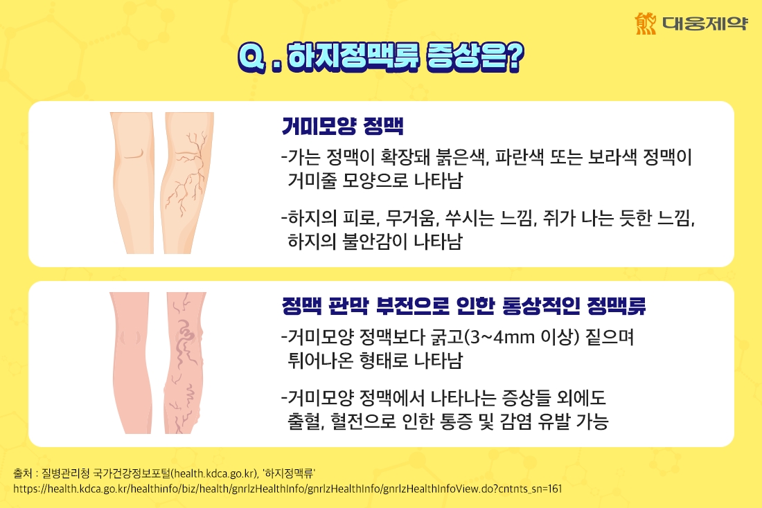 혈관이 피부 위로 올라옵니다. 혈관이 있는 자리에 피부가 부어오른 것처럼 혈관 모양으로 돌출되는 증상이 생깁니다. 다리를 쉬게 해주면 증상은 대부분 가라앉습니다. 그런데 다시 다리를 움직일 경우 같은 증상이 반복됩니다. 이럴 경우 하지 정맥류를 의심해봐야 합니다.