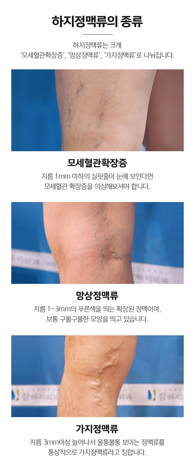 허벅지부터 종아리까지 근육들이 단단해지고 이상 현상이 일어나는 것이 하지정맥류의 대표적인 증상입니다. 오랫동안 서있거나 많이 걷는 사람들에게 나타나기 때문에 다소 헷갈릴 수가 있습니다. 보통 이 통증이 근육통과 비슷하다고 생각할 수 있지만 계속해서 같은 증세가 나타나면 하지정맥류를 생각할 수 있습니다. 이런 비슷한 것들이 지속이 되면 조금의 시간만 서있어도 다리가 무겁거나 저리는 느낌이 오는 경우가 많습니다.